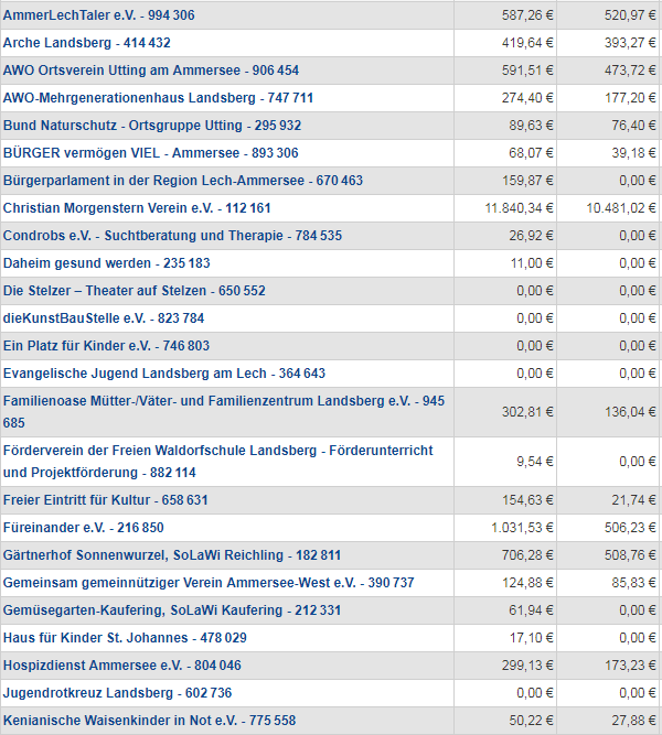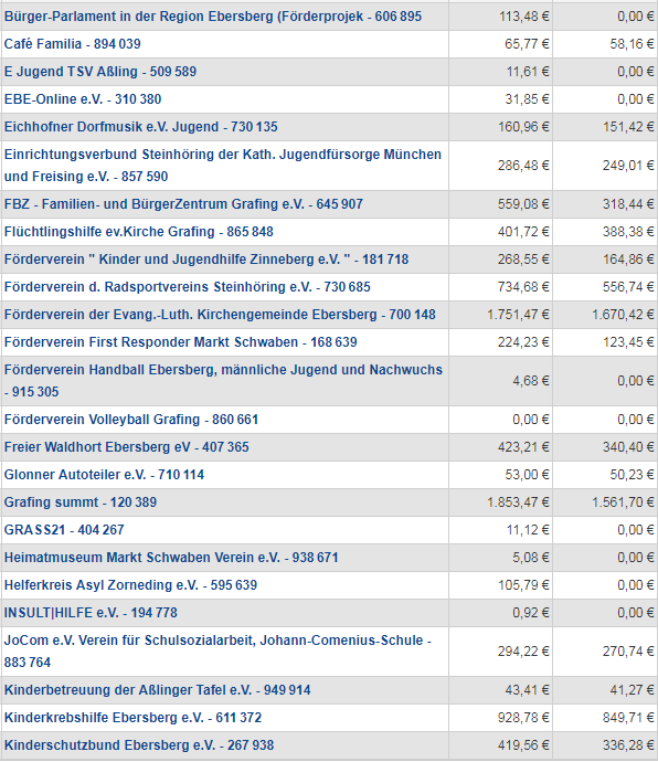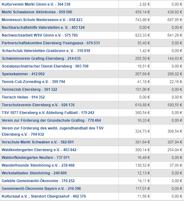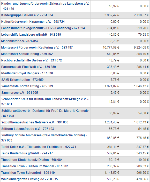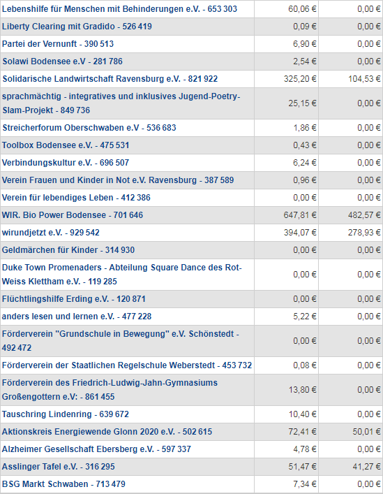 Für 2018 erhält jedes Förderprojekt das in der Spalte: Kontostand aufgeführte Guthaben, abzüglich der bereits ausbezahlten Guthaben.
