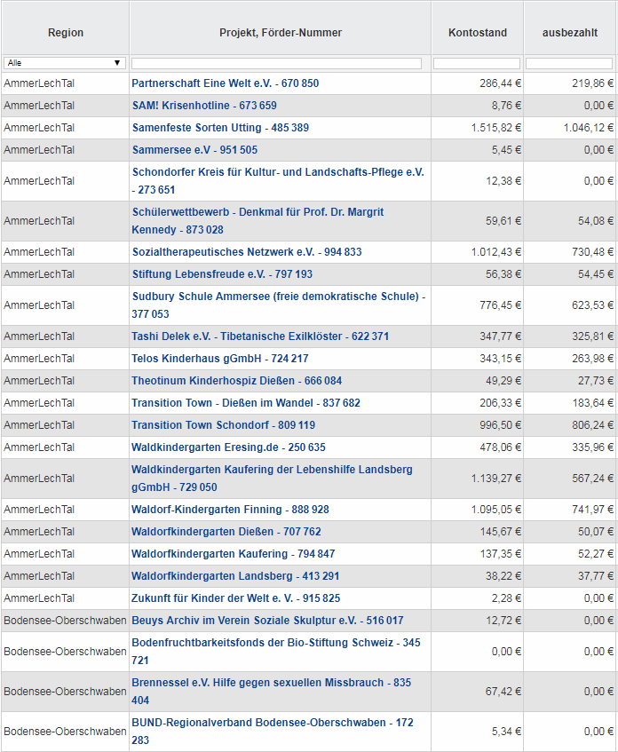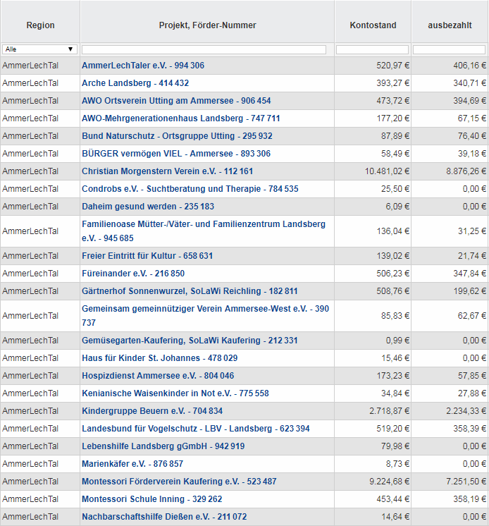 Für 2016 erhält jedes Förderprojekt das in der Spalte: Kontostand aufgeführte Guthaben, abzüglich der bereits ausbezahlten Guthaben.